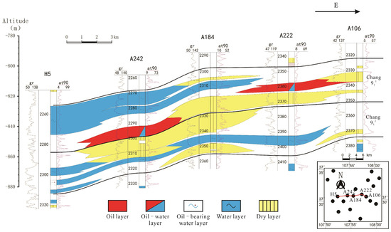 In terms of the profile, the Chang 911 small layer sandstones in wells A184 and A106 have undergone compaction, resulting in poor oil-bearing potential. These sandstones serve as barriers to oil accumulation in wells A242 and A222, leading to the formation of lithological traps (Figure 15).