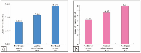 The viscosity of the crude oil ranges from 2.02 to 13.89 Pa·s, indicating generally low viscosity. Further regional analysis shows that the average crude oil viscosities for the northwest, central mixed source, and northeast source areas are 4.67 Pa·s, 6.17 Pa·s, and 7.51 Pa·s, respectively, also reflecting a gradual increase (Figure 16b).