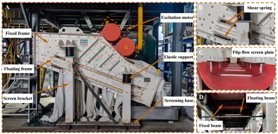 Flip-flow screening experimental system ((A). Front view of the flip-flow screen; (B). Partial diagram of shear spring; (C). Top view of screen-plate; (D). The bottom support beam of the flip-flow screen).