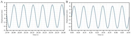 In Figure 2A, the displacement range of the feeding end of the screen-body floating frame is from −5 mm to 7 mm, and the amplitude of the feeding end movement of the screen-body floating frame is 12 mm. In Figure 2B, the displacement range of the discharge end of the screen floating frame is from −7 mm to 6 mm, and the amplitude (the difference between the highest and lowest points of the movement) of the discharge end of the screen floating frame is 13 mm. The displacement magnitudes of the floating frame, in descending order, are: discharge area, feeding area.
