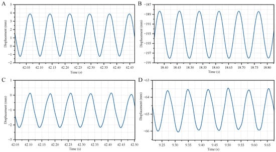 In the feeding area illustrated in Figure 3A,B, the displacement range of the screen-body’s fixed frame along the x-axis is from −1.25 mm to 4 mm, and the displacement range along the y-axis is from −198 mm to 188 mm. Evidently, the variation in displacement amplitude along the y-axis is significantly greater than that along the x-axis. In Figure 3C,D, within the discharge area, the displacement range of the screen-body’s floating frame along the x-axis is from −2.25 mm to 0.25 mm, and the displacement range along the y-axis is from −66 mm to 62 mm. Along the material flow direction, the displacement amplitude of the feeding area of the screen-body’s fixed frame is larger than that of the discharging area. Along the normal direction of the material flow, the displacement amplitude of the discharge area is greater than that of the feeding area. As can be observed from the figure below.