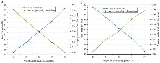 Yield and weighted average particle size of the dry deep flip-flow screening products under different proportions of hindering-particle. ((A). Overflow; (B). Underflow).