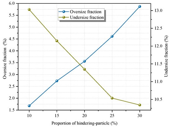 Oversize fraction and undersize fraction of the dry deep flip-flow screening products under different proportions of hindering-particle.