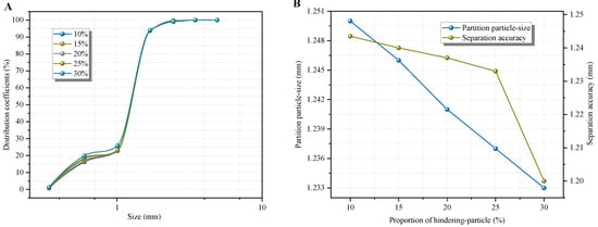 The distribution rate of materials with different particle sizes in the screened product under different hindering particle-size distribution conditions was depicted in Figure 6. As the proportion of hindering-particles increased, the distribution curve gradually shifted to the left. Regarding the distribution rate of materials of the same particle size, the larger the proportion of hindering-particles in the screened feed, the greater the amount of material of that particle size in the screened product. In Figure 6B, as the proportion of hindering-particle rose, their particle-size distribution gradually decreased, ranging from 1.23 mm to 1.25 mm. Simultaneously, the separation accuracy gradually declined, with a range from 0.19 mm to 0.22 mm.
