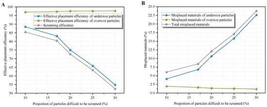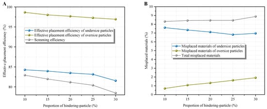 Screening efficiency and total misplaced materials of the dry deep flip-flow screening under different proportions of hindering-particle. ((A). Screening efficiency; (B). Misplaced materials).