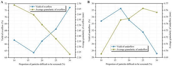 Yield and weighted average particle size of the dry deep flip-flow screening products under different proportions of difficult-to-screen particles. ((A). Overflow; (B). Underflow).