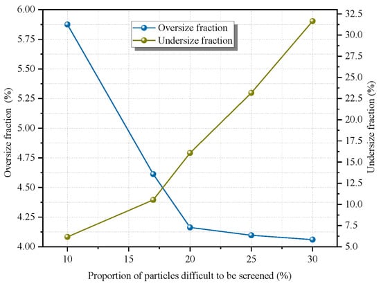 Oversize fraction and undersize fraction of the dry deep flip-flow screening products under different proportions of difficult-to-screen particles.