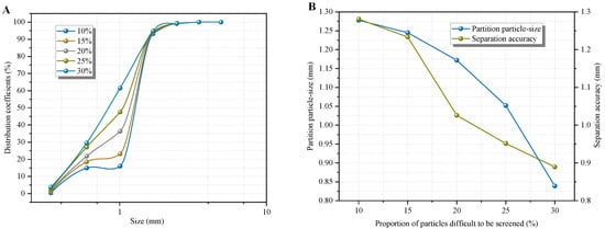 Distribution curve and separation accuracy of the dry deep flip-flow screening products under different proportions of difficult-to-screen particles. ((A). Distribution curve; (B). Separation accuracy).