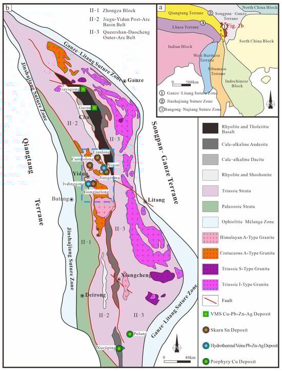 (a) Tectonic map of the Yidun Terrane (modified after [25]). (b) Regional geological map of the Chinese Yidun Terrane (modified after [24,26,27,28]).
