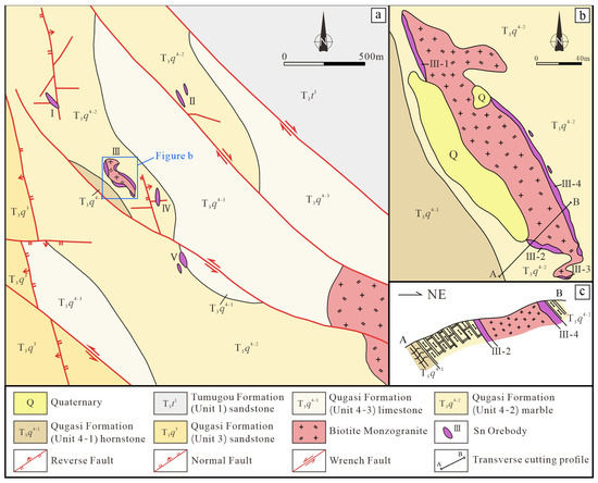 (a,b) Geological map, and (c) cross-section of the Gongjuelong deposit (modified after [36]).