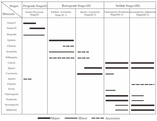 Paragenetic sequence of ore and gangue minerals in the Gongjuelong Sn deposit.