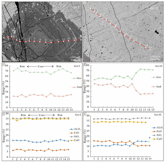 BSE images of Grt-I (a) and Grt-II (b), end member composition maps of Grt-I (c) and Grt-II (d), and the major element variation maps of Grt-I (e) and Grt-II (f) in Gongjuelong deposit.