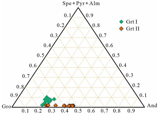 Grt-I: The SiO2 content ranges from 35.9% to 35.3%, with an average of 35.7%. The CaO content is 33.6–35.4%, averaging 35%. Al2O3 is relatively high, ranging from 13.8% to 16.1%, with an average of 14.9%. FeO content ranges from 5.7% to 7.6%, with an average of 6.6%. TiO2, MgO, and MnO are lower (0.5%–3.1%, 0.4%–2.2%, and 0.2%–0.3%, respectively), and P2O5, Na2O, and K2O are all ≤0.01%. Based on the major elements, the garnet is primarily composed of grossular (Gro), with 64%–76%, followed by andradite (And) at 21%–28%, with small amounts of pyrope (Pyr) (2%–10%) and spessartine (Spe) (0.5%–0.8%). Grt-I belongs to the grossular (Gro)–andradite (And) series (Gro 64-76, And 20-28, Spe + Pyr + Alm 2-10, average = And70, Gro24, Spe + Pyr + Alm6) (Figure 5 and Figure 6, Table S1).