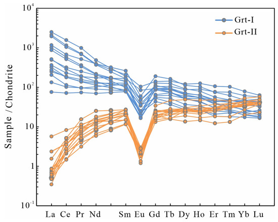 Grt-I in the Gongjuelong Sn deposit is primarily composed of grossular and minor amounts of andradite and trace amounts of manganese–aluminum garnet and magnesium–aluminum garnet (Gro64-76And20-28Spe+Pyr+Alm2.39-10.33). It is similar to late-stage garnets from the skarn-type copper deposits in the Hongniu area of western Yunnan [71]. This indicates that Grt-I is enriched in Al and formed in a low-oxygen fugacity, moderately acidic environment. In terms of Grt-II, grossular remains dominant, and the contents of andradite increase. Grt-II is part of the solid solution series between grossular and andradite (Gro52-73And25-45Spe+Pyr+Alm1-2), with the andradite component being slightly lower than that of grossular, suggesting that Grt-II formed in a weakly reducing, near-neutral environment. From Grt-I to Grt-II, a marked increase in FeO content is observed, whereas the Al2O3 content decreases slightly (Figure 5; Table S1). In Grt-II, the grossular component decreases, whereas the andradite component gradually increases. This suggests that the oxygen fugacity of garnet in the Gongjuelong deposit increased from Grt-I to Grt-II, with the ore-forming environment evolving from relatively reducing to relatively oxidizing conditions, reflecting the progressive changes in the ore-forming environment. However, the end-member composition remains dominated by grossular, indicating that both types of garnet in the Gongjuelong deposit formed under reducing conditions. Notable differences in the REE characteristics are observed between these two types (Figure 8). The REE distribution pattern of Grt-I exhibits a steep rightward skew, whereas Grt-II shows a more gradual leftward skew. The left-skewed REE distribution pattern in Grt-II is similar to that in garnet from the Shizhuyuan [72] and Jinchuantang [73] deposits in southern Hunan, China, whereas the right-skewed pattern in Grt-I is comparable to that in garnet from the Huangshaping deposit [74] in the same region. In addition to the differences in REE distribution patterns, the Eu anomalies in the two types of garnet also differ significantly with Grt-II showing a more pronounced negative Eu anomaly (Figure 8). Moreover, the LREE/HREE ratios differ between the two garnet types. Grt-I exhibits a higher LREE/HREE ratio (2.3 to 32.8, average 11.6). In contrast, Grt-II shows a lower ratio (0.2 to 4.7, average 0.8).