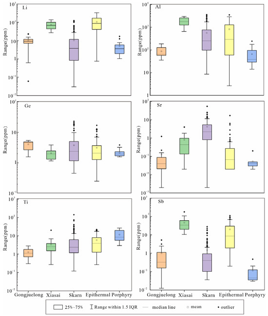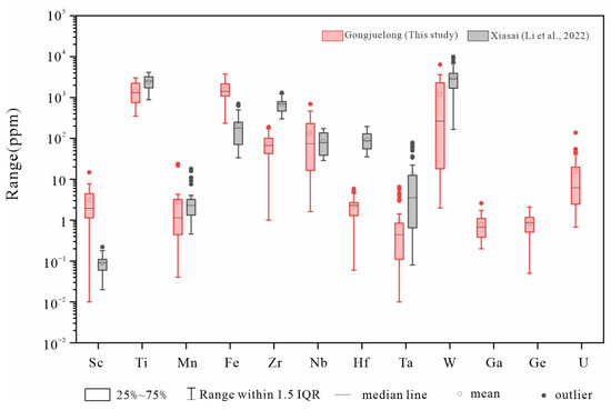 Box plots of selected trace elements in cassiterite from Gongjuelong (data of Xiasai are from [5]).