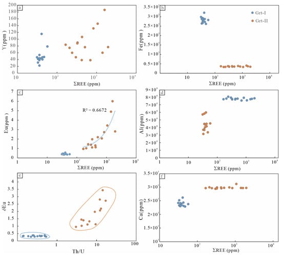 In these equations, X+ represents Na+, X2+ mainly refers to Ca2+, Z3+ represents Al3+ or Fe3+, Y3+ is predominantly replaced by Al3+, Y2+ corresponds to Mg2+ or Fe2+, and [ ] denotes vacancies (Ca). When the Na+ content is high in garnet, Na+ can substitute into the lattice to maintain charge balance, thereby promoting the incorporation of REEs through the first mechanism [50,52]. However, the content of Na in garnet from Gongjuelong is predominantly below detection limits, indicating that the first mechanism is not the primary mechanism for REE incorporation. If REEs are incorporated into garnet through the second mechanism, charge compensation occurs by substituting trivalent cations into the tetrahedral sites [45,53]. In the element correlation diagrams for garnet samples from the Gongjuelong deposit, no clear correlation is observed between ΣREE contents and Al or Fe (Figure 11b,d), indicating that the second substitution mechanism is unlikely to be the dominant mechanism for REE incorporation. Furthermore, the low content of Mg in both garnet types (Table S1) further indicates that Mg is insufficient to facilitate this substitution. Consequently, the third substitution mechanism is unlikely to be the dominant process in this region. A certain degree of linear positive correlation with ΣREE is exhibited only by Eu. Therefore, the fourth substitution mechanism is likely the primary mechanism for REE incorporation into garnet. However, previous studies have demonstrated the substitution of REEs in garnet is not solely governed by crystal chemistry [54,55]; it is also significantly influenced by the physicochemical features of the fluid (e.g., pH, fO2), the water/rock ratio, and the dynamics of mineral growth.