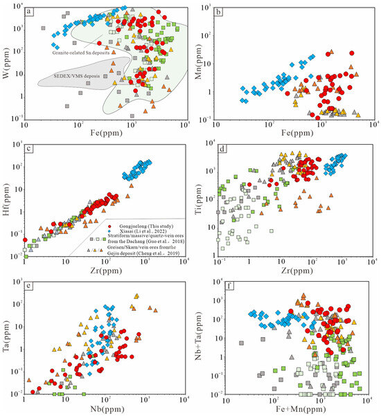 Trace element binary diagrams in cassiterite from the Gongjuelong deposit. Areas of granite-related and Sedex/VMS tin deposits are from [62]. Data from the Gejiu and Dachang Sn deposits are from [60,61], respectively. (a) W vs Fe (b) Mn vs Fe (c) Hf vs Zr (d)Ti vs Zr (e) Ta vs Nb (f) Nb+Ta vs Fe+Mn.