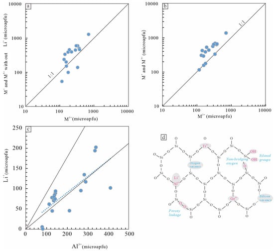Plot of M3+ vs. M+ and M5+ without Li+ (a). Plot of M3+ vs. M+ and M5+ (b). Plot of Al3+ vs. Li+ (c) of quratz from Gongjuelong deposit. Schematic quartz structure showing the most common defect types (d) (modified after [67]).