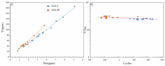 Diagrams of Y-Ho (a) and Y/Ho-La/Ho (b) of garnets in the Gongjuelong Sn polymetallic deposit.