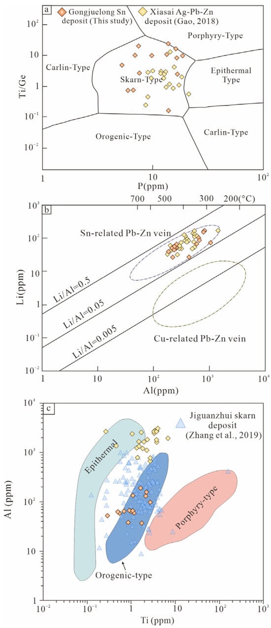 The trace element content of quartz from the Gongjuelong deposit are provided in Table S5. and illustrated in Figure 10. The most abundant trace elements in quartz are Li, Al, Ti, Ge, and P. Among these, Li, Al, and Ti are primarily used for interpretation. The trace element concentrations of quartz in stage III of the Gongjuelong deposit are as follows: Li content ranges from 0.1 to 23.4 ppm, with an average of 10.0 ppm. Al concentrations vary between 35.8 and 185 ppm, with an average of 86.5 ppm. Ti ranges from 0.9 to 2.8 ppm, with an average of 1.0 ppm. Ge concentrations range from 1.6 to 5.5 ppm, with an average of 4.0 ppm. P content varies from 14.0 to 173 ppm, with an average of 64.3 ppm.