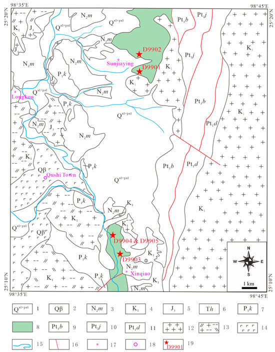 The study area is located in Qushi town, north of Tengchong city, which is part of the eastern Tengchong terrane, with the Gaoligong shear zone to the east (Figure 1b). The stratigraphic sequence in the study area mainly comprises the Neoproterozoic Meijiashan Group, Permian, and Triassic strata (Figure 2). The Meijiashan Group is subdivided into four formations: the Jiuduhe Formation, Danlonghe Formation, Baohuashan Formation, and Erdaohe Formation. The Permian Bangdu Formation consists of silty slate, while the Triassic Hewanjie Formation is characterized by dolomite and dolomitic limestone. The Neogene Mangbang Formation is composed of sandstone, conglomerate, and claystone. Quaternary basalts are extensively distributed along the western margin of the study area, representing the southwestern extension of the Tengchong Volcanic Belt. Intrusive rocks are predominantly Late Jurassic to Early Cretaceous granitoids. NNE-trending fault structures are well developed in the eastern part of the study area, transecting distribution zone of the Meijiashan Group and inducing mylonitization of the host rocks.