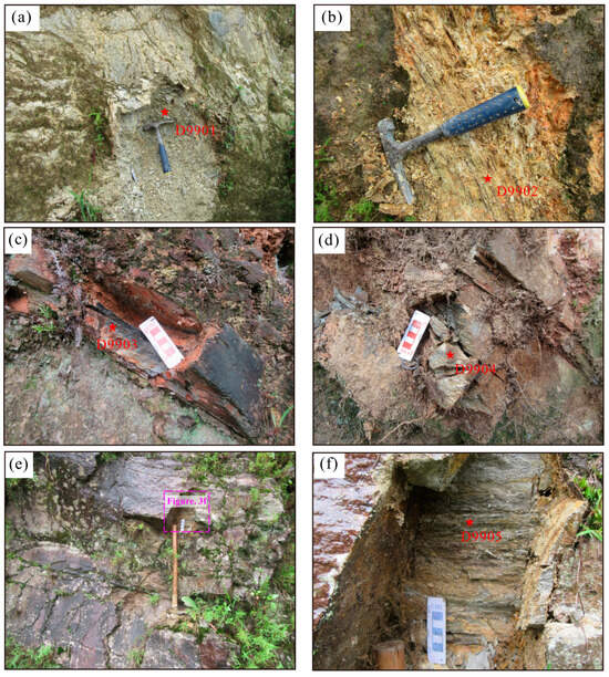 Field photos of the rhyolites for sample D9901 (a), D9902 (b), D9903 (c), D9904 (d), and D9905 (e,f) in the Qushi area.