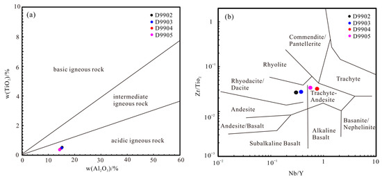 Discrimination diagram of rhyolites in the Qushi area. (a) TiO2 versus Al2O3 diagram (modified after [48,49]); (b) Zr/TiO2 versus Nb/Y diagram (modified after [50]).