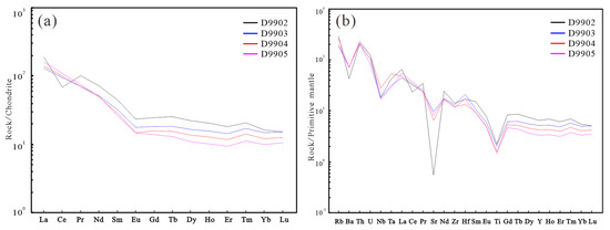 (a) Chondrite-normalized REE for the rhyolites from the Qushi area; (b) Primitive-mantle-normalized trace element patterns for the rhyolites from the Qushi area. The values for chondrite and primitive mantle are from [40].