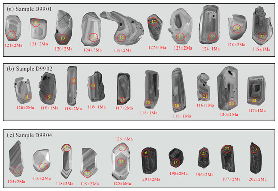 Zircon U-Pb dating via LA-ICP-MS (laser ablation inductively coupled plasma mass spectrometry) was executed at Wuhan Sample Solution Analytical Technology Co., Ltd. in Wuhan, China. The detailed operational conditions for the laser ablation system and ICP-MS instrument, as well as data reduction procedures, are presented in [41]. Laser sampling utilized a GeolasPro laser ablation system, which included a COMPexPro 102 ArF excimer laser (Lambda Physik, Göttingen, Germany; 193 nm wavelength, 200 mJ maximum energy) and a MicroLas optical system. An Agilent 7900 ICP-MS instrument was employed to measure ion signal intensities. Helium was applied as the carrier gas, and argon functioned as the make-up gas, combined with the carrier gas via a T-connector prior to entering the ICP torch. A signal smoothing device, known as the “wire” device, was incorporated into the laser ablation system to enhance signal stability [42]. In this study, the laser spot size was set to 24 µm, and the repetition rate was 6 Hz. For U-Pb dating, zircon 91,500 was used as the external calibration standard [43]. Each analysis included a background acquisition period of approximately 20–30 s to measure the gas blank, followed by 50 s of data acquisition from the sample. The trace element compositions of zircon were calibrated using NIST 610 glass (National Institute of Standards & Technology, Gaithersburg, MD, USA) as an external calibration. The Excel-based software ICPMSDataCal (version 9.5) was utilized for offline data reduction, enabling the selection and integration of background and analytical signals, time-drift correction, and quantitative calibration for U-Pb dating and trace element analysis [44,45]. Weighted mean age calculations and concordia diagrams were generated utilizing Isoplot/Ex version 3.0 [46]. A total of 93 spots were analyzed across three samples (D9901, D9902, D9904) with 206Pb/238U ages (Table S4). Ti-in-zircon thermometry was calculated using the calibration of [47] (Table S5).