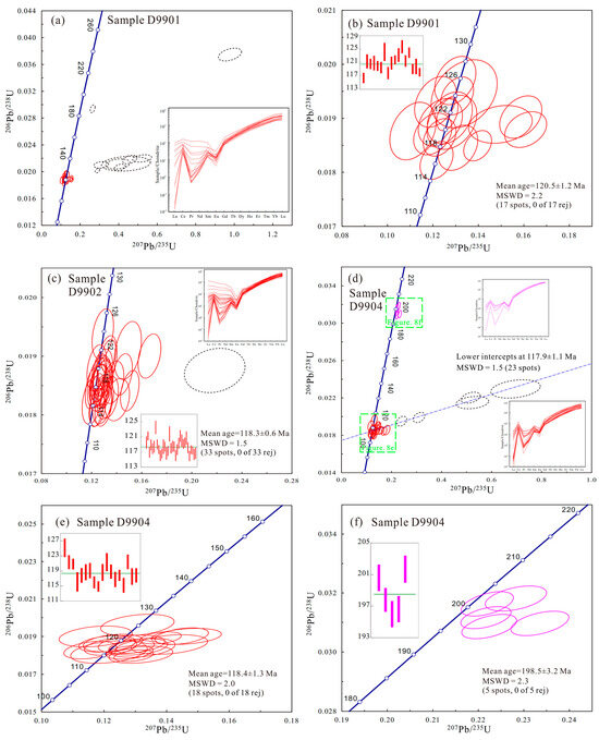 Concordia diagrams, chondrite-normalized rare-earth element patterns, and histograms of Cenozoic ages for the magmatic zircons of rhyolites. (The red circles denote individual zircon analyses from the ca. 120 Ma sample, while the pink circles represent zircon analyses from the ca. 200 Ma sample. The red bar delineates the ca. 120 Ma age range of the younger sample, whereas the pink bar illustrates the ca. 200Ma span of the older sample.) Chondrite values are from [40]. (a) Concordia diagram for Sample D9901, showing the distribution of 206Pb/238U and 207Pb/235U ratios. (b) Concordia diagram for Sample D9901 with age histograms and mean age calculation. (c) Concordia diagram for Sample D9902. (d) Concordia diagram for Sample D9904 with age histograms and mean age calculation. (e) Concordia diagram for Sample D9904 with age histograms and mean age calculation. (f) Concordia diagram for Sample D9904 with age histograms and mean age calculation.