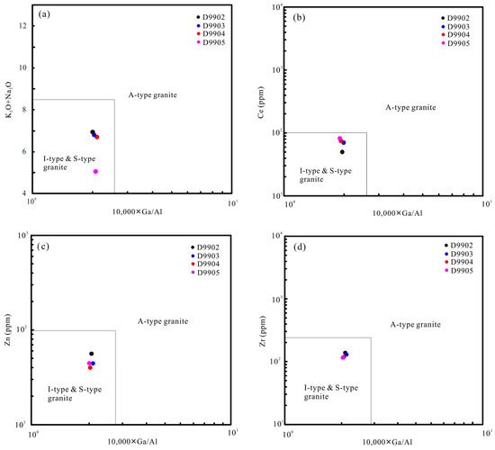 I-type and S-type granite discrimination diagram for the rhyolites from the Qushi area (after [51]). Geochemical classification diagrams for granitic samples. (a) K2O + Na2O vs. 10,000 × Ga/Al diagram, showing the distribution of samples D9902, D9903, D9904, and D9905. The diagram distinguishes A-type granite from I-type and S-type granite. (b) Ce vs. 10,000 × Ga/Al diagram, illustrating the geochemical characteristics of the samples and their classification into A-type or I-type & S-type granite. (c) Zr vs. 10,000 × Ga/Al diagram, further differentiating the granitic samples based on their geochemical properties. (d) Another Zr vs. 10,000 × Ga/Al diagram, providing additional insights into the classification and geochemical features of the samples.