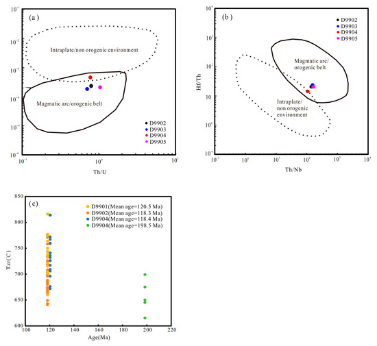 Magmatic zircon trace element discriminating diagrams of rhyolites in the Qushi area (after [73,74]). (a) Th/U vs. Nb/Hf, (b) Th/Nb vs. Hf/Th discrimination diagrams of tectonic setting. (c) Rhyolites Ti-in-Zr temperatures [47]. WPG = within-plate granite, VAG = volcanic arc granite, post-COLG = post-collision granite, syn-COLG = syn-collisional granite, ORG = ocean ridge granite.
