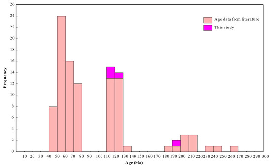 Compared with the Lhasa terrane, the Jurassic–Cretaceous magmatic activity in the Tengchong terrane remains controversial. The igneous activities spanning the Triassic to Jurassic periods in the Tengchong terrane are scattered across the region (Figure 1b). The Early–Middle Triassic igneous events (250–236 Ma) might have resulted from partial melting of the thickened lower crust after the Tengchong and Baoshan terranes collided and merged. The Late Triassic igneous events (219–213 Ma) could be related to the collision with the Indochina terrane [25]. Additionally, the Early Jurassic magmatic events (198–180 Ma) in the Tengchong terrane could be linked to the subduction of the Meso-Tethys Ocean and the collision between the Tengchong terrane and Eurasian continent [25], or they could have formed in the post-collisional tectonic setting response to the Paleo-Tethyan regime [26]. The Early Cretaceous magmatic events have been ascribed to two primary mechanisms: (1) the development of post-collisional arc systems linked to the subduction of the Meso-Tethyan oceanic crust [27,28,29]; and (2) flat subduction processes of the far-field Neo-Tethyan oceanic crust. The geological environment of the Late Cretaceous magmatic events have been variably attributed to (1) syn-collisional [30,31] or (2) extensional settings [32,33]. The Tengchong terrane may exhibit a spatially westward migration pattern with three high-magma-addition-rate events during the Early Cretaceous (ca. 131–111 Ma), Late Cretaceous to Early Cenozoic (ca. 76–64 Ma), and Early Cenozoic (ca. 55–49 Ma) [11,34]. Notably, the Early Cenozoic (55–49 Ma) magmatic episode may correlate with slab break-off following the initial India–Asia collision [11,35].