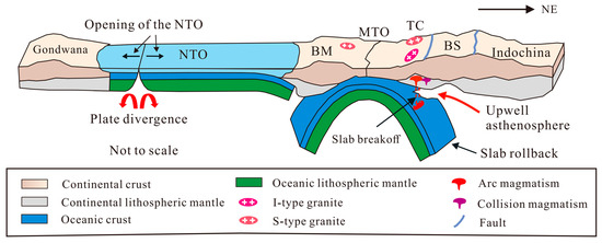 In conclusion, the formation of the Qushi rhyolite may be related to the subduction, slab rollback, slab break-off, and upwelling of the asthenosphere associated with the MTO, and it may also be linked with the final closure of the MTO (the collision and malgamation of the Burma terrane and the Tengchong terrane) (Figure 13).