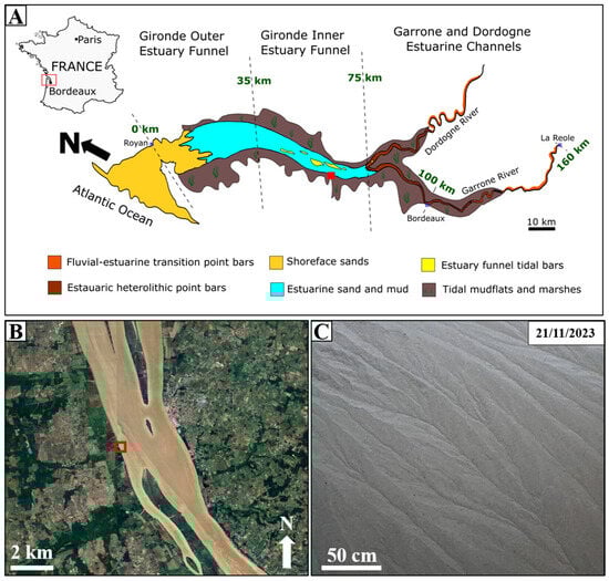 This study utilized sediments from the modern Gironde estuary, located in the Nouvelle-Aquitaine region of southwestern France (Figure 1A). The estuary is one of Europe’s largest estuarine systems, covering an approximate surface area of 630 km2 [32,44]. It extends about 160 km inland from its mouth to its upstream tidal limit [31]. The estuary is fed by two principal rivers, the Garonne and Dordogne, which drain waters from the Pyrenees and the Massif Central, respectively, forming an extensive watershed [45]. The Gironde estuary is macrotidal and characterized by semi-diurnal tides, with tidal ranges varying from 1.5 m during neap tides to 5.5 m during spring tides [32,46]. Its morphology and hydrodynamics are shaped by a complex interplay of fluvial and tidal processes, resulting in different patterns of sediment transport and deposition [31]. The estuary is typically divided into three main zones based on its morphology and hydrodynamics: the outer estuary funnel, the inner estuary funnel, and the Garonne and Dordogne estuarine channels [31,47,48]. A defining feature of the Gironde estuary is its well-developed Turbidity Maximum Zone (TMZ), a highly dynamic region where suspended sediment concentrations can reach up to 300 g/L during slack water [46,49]. The TMZ, which varies seasonally, facilitates hydrodynamic trapping of fine-grained sediments, including clay minerals, fine quartz grains, and organic matter [32].
