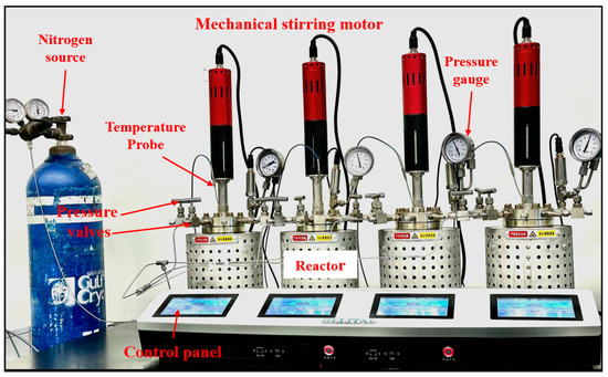 The hydrothermal reactor experiments were conducted using an Ollital OLT-HP-500 (Ollital Tech., Fujian, China) multi-position parallel reactor autoclave system, connected to a nitrogen gas cylinder (Figure 2). This system comprises four stainless steel micro-stirred parallel reactors, each equipped with independent controls for temperature, pressure, and elapsed time. The reactor kettles have a maximum capacity of 500 mL and can be heated to temperatures of up to 350 °C and pressures of 160 bars. Temperature regulation is achieved through a Smart PID algorithm control system, ensuring an accuracy of ±0.1 °C. The sediment samples were divided into twelve portions before the experiments, each weighing 20 g. For each experiment, 20 g of sediment were placed into a 50 µm stainless steel mesh and positioned at the bottom of the reactor kettles. The kettles were then filled with 200 mL of the respective experimental solutions, as outlined in Table 1. The experimental solutions included the following: Red Sea water for experiments 1–5; a 0.1 M KCl-enriched Red Sea water solution for experiment 6; a single 0.1 M mixed solution containing NaCl, KCl, CaCl2·2H2O, and MgCl2·6H2O for experiments 7–10; Gironde estuarine water for experiment 11; and a 0.1 M Na2CO3 solution for experiment 12. Each salt in the mixed solution for experiments 7–10 was prepared at an individual concentration of 0.1 M, ensuring that all major cations were included at equal molarity.