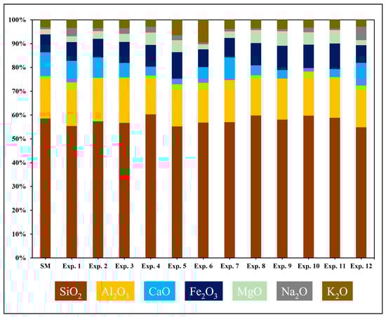 A 2D stacked column plot of XRF analysis illustrating the normalized concentration and distribution of major oxides in the sediments before and after the hydrothermal experiments. Note the relative abundance and evolution of CaO, MgO, Fe2O3, and K2O across the different experiments.
