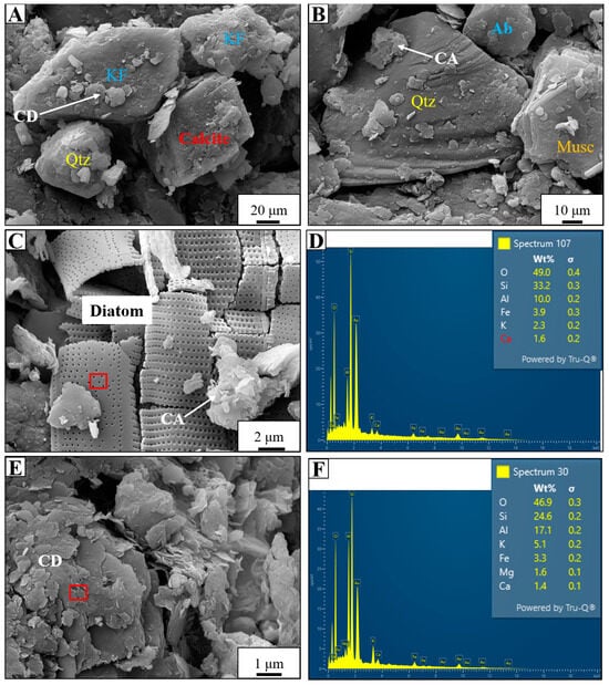 SEM and EDS images illustrating detrital framework grains and clay coatings. (A) SEM image showing detrital quartz (Qtz), K-feldspar (KF), and calcite, with clay drapes (CDs) coating the K-feldspar. (B) SEM image highlighting detrital albite (Ab), muscovite (Musc), and clay aggregates (CAs) coating a quartz grain. (C) SEM image and (D) corresponding EDS spectra depicting a diatom embedded within detrital clay coats, with the red square in (C) marking the point of the EDS analysis shown in (D). (E) High-resolution SEM image of a detrital clay drape (CD), with the red square indicating the point of the EDS analysis displayed in (F). (F) EDS spectra of the clay drape in (E) revealing the presence of kaolinite, smectite, and illite.