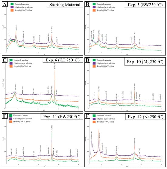 XRD patterns of the oriented clay fraction (<2 µm) from the starting material and selected experiments. (A) Overlaid diffractograms of the starting material reveal the presence of smectite, illite, and kaolinite as the primary detrital clays in the sediments. (B) Diffractograms of air-dried, ethylene glycol-solvated, and heated clay fractions from Exp. 5 show the presence of smectite, kaolinite, and illite. Notably, the kaolinite peaks exhibit a decrease in intensity, and the primary smectite peak shifts from 14.90 Å in the air-dried pattern to 16.99 Å following ethylene glycol solvation. (C) Air-dried, ethylene glycol-solvated, and heated diffractograms from Exp. 6 reveal the presence of illite and kaolinite. Smectite peaks are absent, kaolinite peaks are significantly weakened, and an increase in the intensity of the illite peak is observed, alongside the appearance of sylvite. (D,E) Overlaid diffractograms from Experiments 10 and 11 indicate the authigenic formation of chlorite along with the presence of illite and kaolinite. (F) Diffractograms from Exp. 12 confirm the presence of illite, smectite, and kaolinite.
