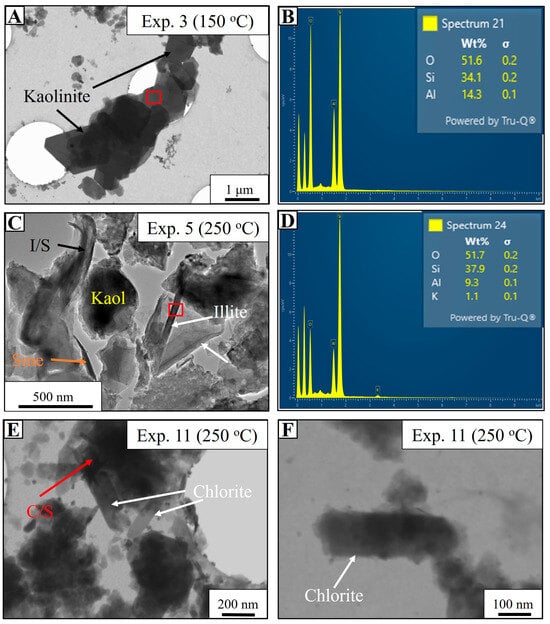 SEM and EDS analyses of low-temperature experiments (Experiments 1 and 2) show minimal changes in detrital grain distribution, with no significant mineralogical transformations observed (Figure 7A). However, SEM reveals the disaggregation and partial dissolution of aggregated detrital grain coats in Exp. 2 (Figure 7A). During Exp. 3 (150 °C), smectite precipitates adjacent to kaolinite platelets, forming incipient crenulated to honeycomb morphologies (Figure 7B). These newly formed smectite coatings develop further in Exp. 4 (200 °C), displaying improved internal structures and crystallinity (Figure 7C). Illitization of smectite begins in Exp. 4 and progresses into Exp. 5 (250 °C). SEM shows the replacement of smectite by mixed-layer illite/smectite and eventually illite, which retains the honeycomb morphologies of smectite but develops spiny terminations characteristic of illite (Figure 7D,E). EDS confirms that the newly formed illite is dominated by Si, O, Al, and K, with minor Fe (Figure 7F). STEM analyses further identify pseudohexagonal kaolinite, smectite, and illite in Exp. 5 (Figure 8).