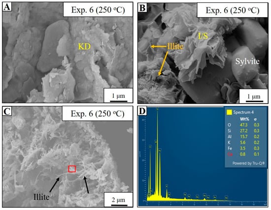 In Exp. 6, SEM and EDS analyses reveal similar transformations to those observed in Exp. 5. SEM observations show the dissolution of kaolinite and the formation of sylvite adjacent to mixed-layer illite/smectite (Figure 9A,B). Newly formed illite from smectite displays rugged honeycomb morphologies, while illitized kaolinite exhibits flaky to radial morphologies with hairy spikes (Figure 9C). EDS analysis confirms that illite is dominated by Si, Al, O, K, and minor amounts of Fe and Ca (Figure 9D).
