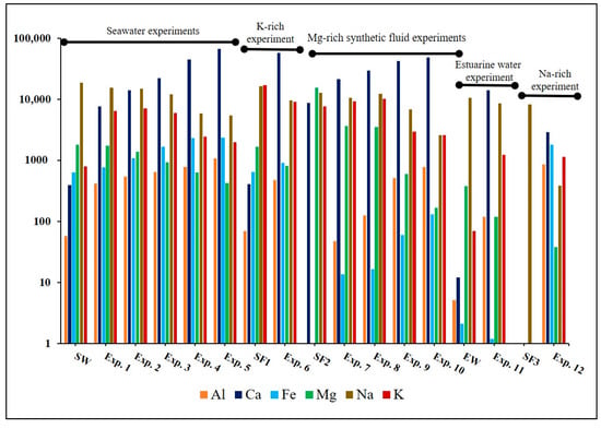 Clustered histogram displaying the concentrations of Al, Ca, Fe, Mg, Na, and K in pre-experiment solutions and their subsequent evolution post-experiments.