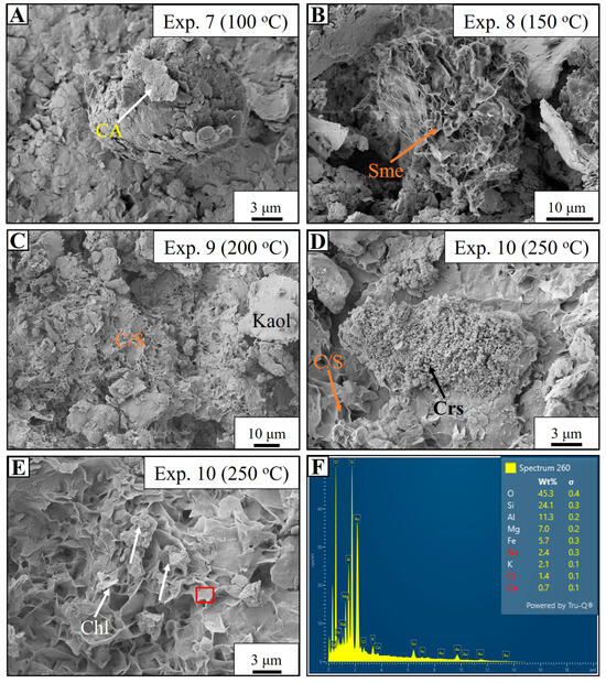 SEM analysis revealed the onset of detrital aggregate dissolution without new mineral formation in Exp. 7 (Figure 11A). However, evidence of smectite transformation was observed in Exp. 8 (Figure 11B). Mixed-layer chlorite/smectite with a rugged, honeycomb morphology appeared in Exp. 9, adjacent to kaolinite platelets (Figure 11C). Additionally, abundant microcrystalline quartz aggregates developed alongside the transforming mixed-layer chlorite/smectite in Exp. 9 (Figure 11D). Fully developed chlorite with a mixed honeycomb-to-rosette morphology was observed in Exp. 10 (Figure 11E), suggesting partial replacement of smectite while retaining its morphology. EDS analysis identified Si, O, Al, Mg, and Fe as the major elements in the newly formed chlorite, with minor amounts of Na, K, and Ca (Figure 11F).