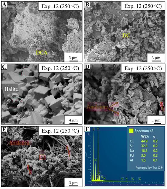 Main diagenetic features in Exp. 12 (conducted with Na-rich synthetic fluid). (A) SEM image showing the onset of detrital clay disaggregation (DCA). (B) SEM image showing detrital clay dissolution (DC). (C) SEM image highlighting the formation of cubic halite crystals. (D,E) SEM images depicting the development of massive aggregates (D) and acicular-to-botryoidal (E) authigenic analcime. (F) EDS spectra of the newly formed analcime, indicating its high Na content. The red square in (E) marks the location of the EDS analysis.