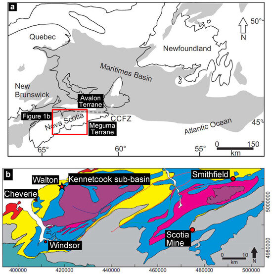 The Walton deposit is located in the Kennetcook sub-basin of southern Nova Scotia, which overlies siliciclastic basement rocks of the Meguma terrane, the most outboard terrane of the northern Appalachian orogenic collage (Figure 1a,b). This terrane was emplaced against the adjacent Avalon terrane coincident with the closure of the Rheic Ocean around the Late Devonian, with the suture delineated by the E-W trending Cobequid-Chedabucto Fault Zone (CCFZ; Figure 1a) [39]. The Meguma terrane is dominated by metaturbiditic rocks of the Ediacaran-Ordovician Meguma Supergroup [40] and late Devonian meta- to peraluminous granites (ca. 380 Ma; [41]), with lesser amounts of Silurian to Triassic strata.