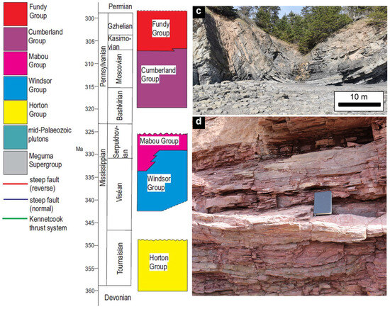 Overlying the Windsor Group is the late Viséan to Namurian Mabou Group, which contains grey to red mudrocks and small amounts of lacustrine evaporites [43]. The Pennsylvanian Scotch Village Formation of the Cumberland Group unconformably overlies the Windsor Group and consists of sandstone, grey shale, and coal and wood fragments [43]. Waldron et al. [58] noted evidence for the deformation of the Horton, Windsor, and Mabou groups and interpreted the deformation to predate the deposition of the Scotch Village Formation. At Walton, the Horton Group is thrust over the Macumber Formation [43].