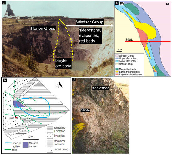 (a) Archive photo of the open pit at the Walton mine (ca. 1970) from the files of the Nova Scotia Department of Sustainable Resources. (b) Schematic diagram showing part of the Walton deposit from Conliffe et al. [27], as modified after Sangster et al. [33]. Location of the 850 L mining level is noted. (c) Plan map of the Walton deposit area modified from Boyle et al. [65]. Location of the shaft depicted in (a) is marked by a red square. (d) Outcrop in the west wall of the former open pit at Walton showing siderostone crosscut by massive coarse-grained baryte.