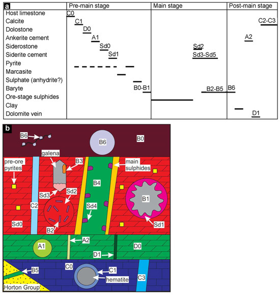 (a) Mineral paragenesis at Walton based on earlier studies of Boyle [32], Burtt [29], and this study. (b) Interpretive summary diagram with the terms shown incorporated from the mineral paragenesis.