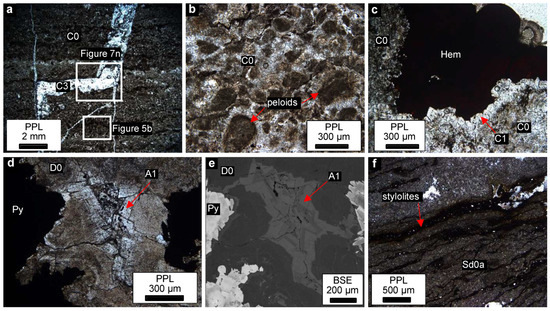 Unmineralised and unaltered laminated Macumber Formation limestone from Cheverie (~30 km from the Walton deposit) provides insight into the nature of the host rocks prior to alteration and mineralisation. The limestone is a peloidal wackestone/packstone with peloids up to 500 µm, carbonate mud, and minor primary porosity (Figure 5a,b) that corresponds to the laminated carbonate rock of the upper Macumber Formation [53]. The limestone is referred to as C0. The edges of the pore spaces in C0 are lined with a clear calcite cement (C1) and locally occluded by botryoidal hematite of unclear timing (Figure 5c). Limestone was not present in any samples from the deposit area used in this study.