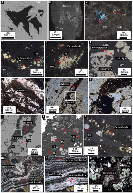 Predating the main stage mineral phases are a variety of pyrite types found in siderostone: framboids, cubes, overgrowths, and replacive (Figure 6d–f). Stylolite swarms of coalesced pressure-solution seams (up to 1 mm; Figure 5f and Figure 6g–l) are common in laminated siderostone and contain pyrite framboids, siderite, rutile, quartz, K-feldspar, chalcopyrite, tennantite, and baryte.